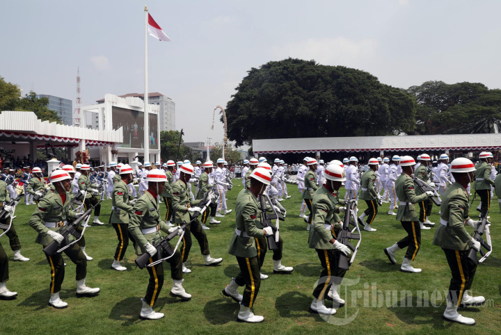 Sejumlah Prajurit TNI berjoget saat hiburan dalam Upacara Peringatan Detik-Detik Proklamasi Kemerdekaan ke-78 Republik Indonesia di Istana Merdeka, Jakarta, Kamis (17/8/2023). HUT ke-78 RI mengangkat tema Terus Melaju untuk Indonesia Maju. TRIBUNNEWS/IRWAN RISMAWAN