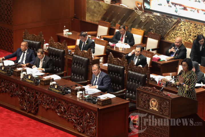 RAPAT PARIPURNA - Menteri Keuangan Sri Mulyani Indrawati menyampaikan keterangan Pemerintah pada Rapat Paripurna ke-21 Masa Persidangan IV Tahun Sidang 2024-2025 di Kompleks Parlemen, Senayan, Jakarta, Selasa (1/7/2025). Rapat Paripurna tersebut beragendakan membahas penyampaian keterangan Pemerintah terhadap RUU tentang Pertanggungjawaban atas Pelaksanaan APBN tahun 2024, tanggapan Pemerintah terhadap pandangan fraksi-fraksi atas Kerangka Ekonomi Makro (KEM) dan Pokok-Pokok Kebijakan Fiskal (PPKF) RAPBN TA 2026, pendapat fraksi-fraksi atas usul rancangan peraturan DPR RI tentang rencana strategis tahun 2025-2029, serta penetapan mitra kerja Danantara. TRIBUNNEWS/IRWAN RISMAWAN
