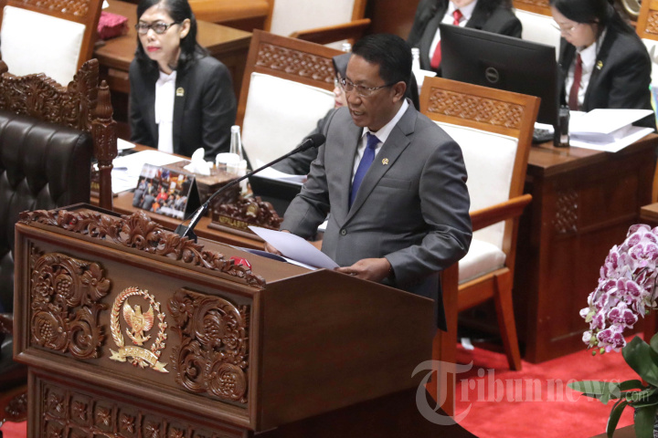 RAPAT PARIPURNA - Menteri Hukum Supratman Andi Agtas menyampaikan pandangan akhir Pemerintah saat Rapat Paripurna Ke-8 Masa Persidangan II Tahun Sidang 2025-2026 di Kompleks Parlemen Senayan, Jakarta, Selasa (18/11/2025). Rapat Paripurna tersebut menyetujui Rancangan Undang-Undang (RUU) tentang Perubahan atas Undang-Undang Nomor 8 Tahun 1981 tentang Kitab Undang-Undang Hukum Acara Pidana (KUHAP) untuk disahkan menjadi undang-undang. TRIBUNNEWS/IRWAN RISMAWAN