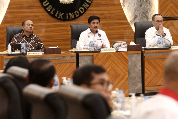 Menteri Koordinator Bidang Politik, Hukum dan Keamanan (Menko Polhukam) Hadi Tjahjanto (tengah) bersama Menteri Komunikasi dan Informatika (Menkokinfo) Budi Arie Setiadi (kiri) dan Kepala PPATK Van Yustiavandana (kanan) mengikuti rapat Satuan Tugas Pemberantasan Judi Online di Kantor Kemenko Polhukam, Jakarta, Rabu (19/6/2024). Rapat tersebut merupakan rapat perdana Satgas Pemberantasan Judi Online setelah dibentuk oleh Presiden Joko Widodo melalui Keputusan Presiden (Keppres) Nomor 21 Tahun 2004 untuk mendukung percepatan pemberantasan perjudian online secara terpadu. TRIBUNNEWS/IRWAN RISMAWAN