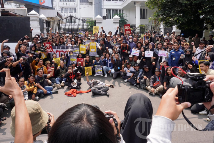 Ratusan wartawan yang tergabung dalam Soladiratitas Jurnalis Bandung dan sejumlah mahasiswa menggelar aksi unjuk rasa menolak pengesahan Rancangan Undang-Undang (RUU) Penyiaran menjadi Undang-Undang (UU), di depan Kantor DPRD Provinsi Jawa Barat, di Jalan Diponegoro, Kota Bandung, Jawa Barat, Selasa (28/5/2024). Para jurnalis menilai RUU Penyiaran dapat mengancam kebebasan pers dan berekspresi, sehingga mereka sepakat menolak pasal yang memberikan wewenang lebih pada pemerintah untuk mengontrol konten siaran, menolak pasal yang memperketat regulasi terhadap media independen dan menolak pasal yang mengatur sanksi berat untuk pelanggaran administratif. (TRIBUN JABAR/GANI KURNIAWAN)