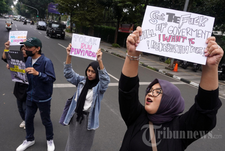 Sejumlah mahasiswa bergabung bersama ratusan wartawan yang tergabung dalam Soladiratitas Jurnalis Bandung menggelar aksi unjuk rasa menolak pengesahan Rancangan Undang-Undang (RUU) Penyiaran menjadi Undang-Undang (UU), di depan Kantor DPRD Provinsi Jawa Barat, di Jalan Diponegoro, Kota Bandung, Jawa Barat, Selasa (28/5/2024). Para jurnalis menilai RUU Penyiaran dapat mengancam kebebasan pers dan berekspresi, sehingga mereka sepakat menolak pasal yang memberikan wewenang lebih pada pemerintah untuk mengontrol konten siaran, menolak pasal yang memperketat regulasi terhadap media independen dan menolak pasal yang mengatur sanksi berat untuk pelanggaran administratif. (TRIBUN JABAR/GANI KURNIAWAN)