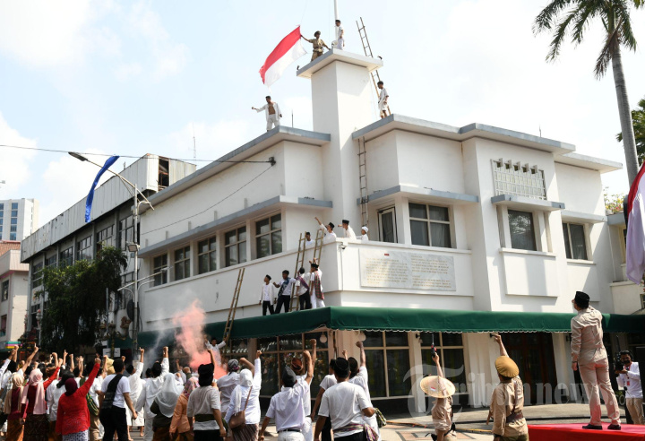 PEROBEKAN BENDERA - Gelaran drama teatrikal bertajuk "Teatrikal Refleksi Perobekan Bendera 19 September 1945" berlangsung di depan Hotel Majapahit, Jalan Tunjungan Surabaya, Minggu (22/9/2024). Drama yang menceritakan perobekan bendera merah putih biru menjadi merah putih ini dipimpin langsung Wali Kota Surabaya Eri Cahyadi yang sekaligus berperan sebagai Residen Soedirman. (SURYA/HABIBUR ROHMAN)