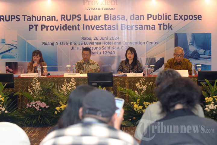 Presiden Direktur PT Provident Investasi Bersama Tbk (PALM) Tri Boewono (kiri) bersama Direktur PALM Ellen Kartika (tengah), dan Direktur PALM Budianto Purwahjo (kanan), saat sesi Public Expose Tahunan Perseroan yang berlangsung di JS Luwansa Hotel and Convention Center pada Rabu, (26/6/2024). PALM berencana fokus meningkatkan kegiatan investasi di 3 sektor utama yaitu sumber daya alam; teknologi, media dan telekomunikasi; serta logistik. PALM juga terus memperkuat struktur permodalan melalui sejumlah aksi korporasi yang telah dilaksanakan, seperti penerbitan obligasi dan penerbitan saham. Per Kuartal I-2024, PALM masih memiliki limit dari Penawaran Umum Berkelanjutan Obligasi Berkelanjutan II sebesar Rp4,17 triliun, yang dapat diterbitkan sewaktu-waktu sampai dengan Kuartal?IV-2025. TRIBUNNEWS/HO