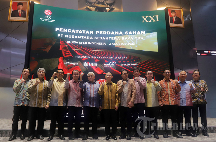 Head of Investment Banking Indonesia JP Morgan Sekuritas Edmond, Komisaris Independen PT Nusantara Sejahtera Raya Tbk Ongki Wanadjati Dana, Komisaris PT Nusantara Sejahtera Raya Tbk Sacheen Harris Lasmana, Komisaris Utama PT Nusantara Sejahtera Raya Tbk Suryo Suherman, Komisaris PT Nusantara Sejahtera Raya Tbk Harris Lasmana, Founder PT Nusantara Sejahtera Raya Tbk Benny Suherman, Direktur Penilaian Perusahaan Bursa Efek Indonesia I Gede Nyoman Yetna, Direktur Utama PT Nusantara Sejahtera Raya Tbk Hans Gunadi, Direktur PT Nusantara Sejahtera Raya Tbk Arif Suherman, Direktur Utama PT Mandiri Sekuritas Oki Ramadhana, Presiden Direktur PT Indo Premier Sekuritas Moleonoto The, Komisaris Independen PT Nusantara Sejahtera Raya Tbk Mohammad Noor Rachman Soejoeti berfoto bersama usai melakukan penekanan tombol sebagai tanda PT Nusantara Sejahtera Raya Tbk (CNMA) resmi melantai di Bursa Efek Indonesia (BEI), Jakarta Pusat, Rabu (2/8/2023). PT Nusantara Sejahtera Raya Tbk (CNMA) melepas sebanyak-banyaknya 8,33 miliar saham ke publik, atau 10,0% dari modal ditempatkan dan disetor setelah IPO. Pada awal perdagangan pagi ini, harga saham CNMA langsung menguat 8,15%.Saham CNMA berada di level Rp 292 per saham atau menguat 22 poin. Tribunnews/Jeprima