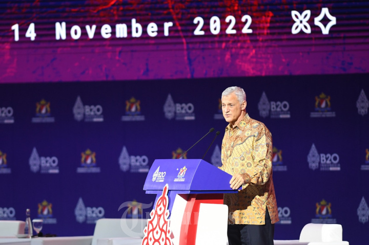 TRIBUNNEWS.COM, BALI - Standard Chartered Bank (SCB) Group CEO Bill Winters memberikan keynote speech di acara B20 Summit Indonesia 2022 (13/11/22) di Bali. Dalam sambutannya, Bill menekankan pentingnya kemitraan yang kuat antara sektor publik dan swasta untuk memobilisasi keuangan dan menyalurkan dana guna membiayai proyek transisi menuju net-zero di negara-negara berkembang, salah satunya melalui blended finance. The B20 Finance and Infrastructure Task Force, dimana Bill berperan sebagai Co-chair, telah menekankan pentingnya blended finance sebagai prioritas untuk mewujudkan transisi energi dan menutup kesenjangan infrastruktur. SCB secara global berkomitmen untuk menyalurkan USD300 miliar untuk pembiayaan transisi ke energi bersih selama periode 2021 - 2030. //IST/HO