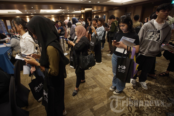 Pengunjung memadati pameran pendidikan internasional, study in UK (SI-UK), di Jakarta Pusat, Sabtu (7/10/2023). Pameran pendidikan yang dikhususkan untuk calon mahasiswa yang ingin belajar di Inggris Raya (UK) ini diikuti lebih dari 30 universitas dan instansi yang tergabung dalam SI-UK EXPO 2023. TRIBUNNEWS/HERUDIN