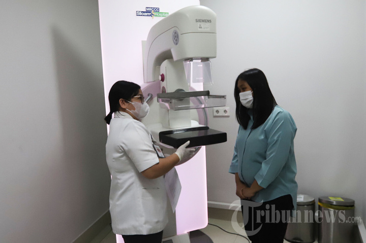 Petugas medis memberikan penjelasan mengenai mesin yang akan digunakan untuk mendeteksi kanker payudara di Gedung MRCCC Siloam Semanggi, Jakarta Selatan, Selasa (7/3/2023). Sebagai perwujudan komitmen pelayanan kepada masyarakat secara berkelanjutan, khususnya penanganan kanker di Indonesia, Siloam Hospitals Group akan mengadakan program skrining kanker payudara secara gratis untuk 25.000 wanita di seluruh Indonesia. Menargetkan wanita usia 35 tahun ke atas, program ini juga akan tersedia bagi kalangan perempuan dengan keterbatasan akses kesehatan. TRIBUNNEWS/JEPRIMA