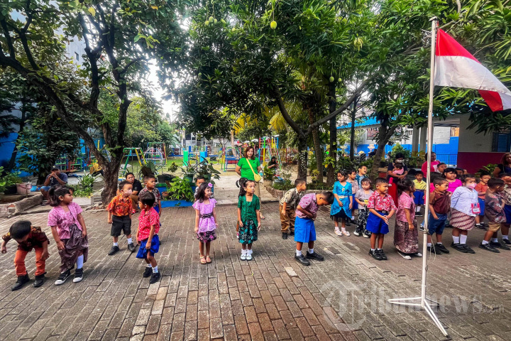 Sejumlah siswa Taman Kanak Strada Santa Theresia saat berlenggak menggunakan kebaya dan batik pada peringatan Hari Kebaya Nasional di Kawasan Dewa Ruci, Cilincing, Jakarta Utara, Rabu (24/7/2024). Sejumlah siswa-siswi menggunakan kebaya dan batik saat melakukan fashion show pada peringatan Hari Kebaya Nasional di sekolah tersebut guna mengenalkan budaya Indonesia salah satu pakaian batik dan kebaya dan juga menanamkan kecintaan terhadap budaya Indonesia sejak dini. (Warta Kota/Yulianto)