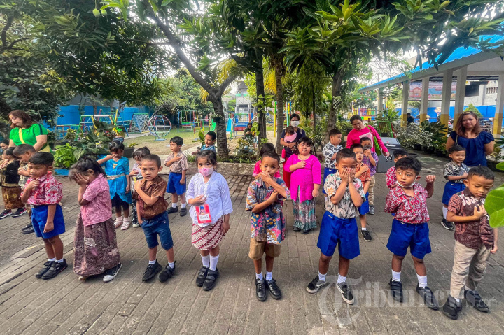 Sejumlah siswa Taman Kanak Strada Santa Theresia saat berlenggak menggunakan kebaya dan batik pada peringatan Hari Kebaya Nasional di Kawasan Dewa Ruci, Cilincing, Jakarta Utara, Rabu (24/7/2024). Sejumlah siswa-siswi menggunakan kebaya dan batik saat melakukan fashion show pada peringatan Hari Kebaya Nasional di sekolah tersebut guna mengenalkan budaya Indonesia salah satu pakaian batik dan kebaya dan juga menanamkan kecintaan terhadap budaya Indonesia sejak dini. (Warta Kota/Yulianto)