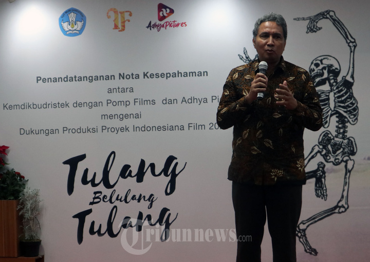 TRIBUNNEWS.COM, JAKARTA - Salah satu skenario terpilih dari Program Indonesiana Film yang difasilitasi Direktorat Jenderal Kebudayaan, Kementerian Pendidikan, Kebudayaan, Riset dan Teknologi (Kemendikbudristek) dengan judul "Tulang Belulang Tulang" berhasil menarik investor Adhya Pictures. Acara Penandatanganan Nota Kesepahaman antara Kemendikbudristek dengan Pomp Films dan Adhya Pictures dilakukan, Rabu (8/3/2023) di Kemendikbud Jakarta.