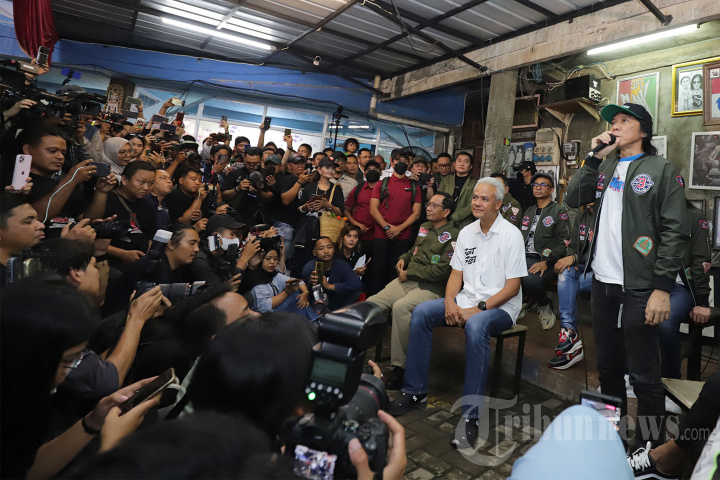 Drumer grup musik Slank Bimbim memberikan kata sambutan disaksikan Pasangan Calon presiden (Capres) dan Calon Wakil Presiden (Cawapres) nomor urut 3 Ganjar Pranowo - Mahfud MD pada acara deklarasi dukungan grup musik Slank di kawasan Duren Tiga, Jakarta Selatan, Sabtu (20/1/2024). Grup musik Slank resmi mendukung pasangan capres dan cawapres Ganjar Pranowo - Mahfud MD untuk meraih kemenangan pada Pemilu 2024. Tribunnews/Jeprima