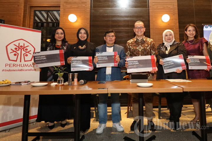 Sekretaris Umum Perhumas, Benny Siga Butarbutar, Ketua Umum Perhumas, Boy Kelana Soebroto (tengah), Wakil Ketua Umum Perhumas bid. Pelatihan Kehumasan, Nurlaela Arief (ketiga kanan) saat sosialisasi Perhumas Indicators, Jakarta, Senin (18/9/2023). Ketua Umum Organisasi Profesi Kehumasan Indonesia (PERHUMAS), Boy Kelana Soebroto, menegaskan perusahaan yang melakukan terobosan inovasi dan memberikan manfaat paling besar bagi customer dan masyarakat akan mendorong lompatan peningkatan kepercayaan dan reputasi perusahaan atau lembaga karena mampu mempertahankan relevansi produk dan jasa secara berkelanjutan. Kajian PERHUMAS Indicators ini merupakan terobosan dari PERHUMAS untuk membuktikan profesi kehumasan mampu membantu secara signifikan manajemen puncak dalam proses pengambilan keputusan yang penting bagi kesuksesan perusahaan atau suat lembaga. TribunNews/HO