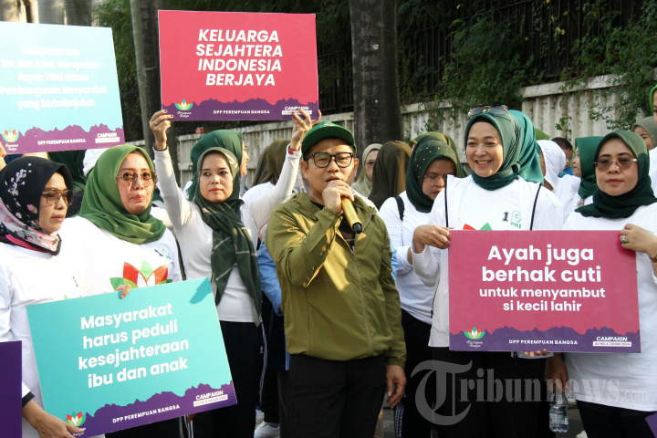 Wakil Ketua DPR RI yang juga Ketua Umum Partai Kebangkitan Bangsa Muhaimin Iskandar memberikan orasi saat mensosialisasikan UU Kesejahteraan Ibu dan Anak (KIA) pada Hari Bebas Kendaraan Bermotor (HBKB) di Jakarta, Minggu (21/7/2024). Kegiatan tersebut untuk mensosialisasikan Undang-Undang Nomor 4 Tahun 2024 tentang Kesejahteraan Ibu dan Anak pada Fase Seribu Hari Pertama Kehidupan (UU KIA) dalam rangka memperingati Hari Anak Nasional pada 23 Juli mendatang. TRIBUNNEWS/IRWAN RISMAWAN
