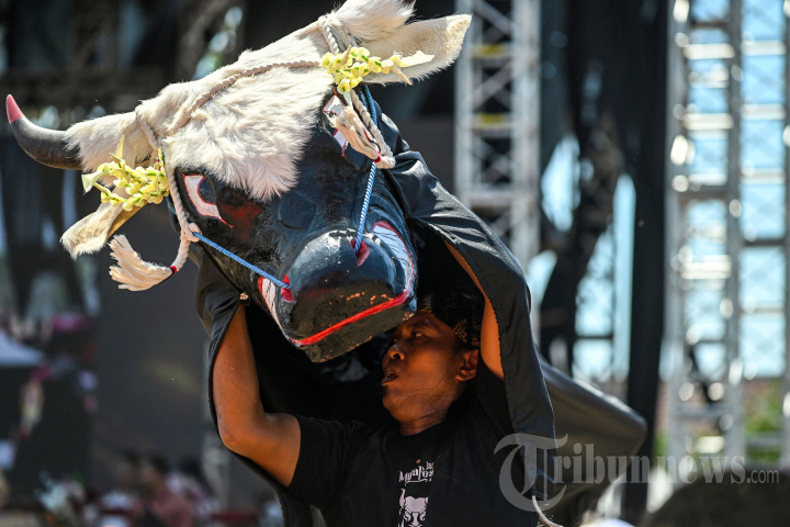 Seniman mengikuti tarian 100 Bantengan saat upacara pembukaan Majafest di Pacing, Kabupaten Mojokerto pada 3 Agustus 2023. (Photo by JUNI KRISWANTO / AFP)