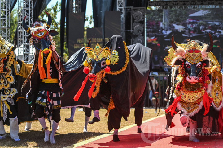 Seniman mengikuti tarian 100 Bantengan saat upacara pembukaan Majafest di Pacing, Kabupaten Mojokerto pada 3 Agustus 2023. (Photo by JUNI KRISWANTO / AFP)