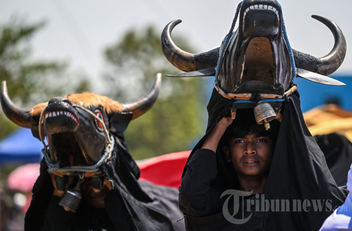 Seniman mengikuti tarian 100 Bantengan saat upacara pembukaan Majafest di Pacing, Kabupaten Mojokerto pada 3 Agustus 2023. (Photo by JUNI KRISWANTO / AFP)