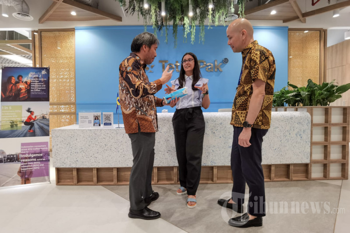 BISNIS KOPI - Marketing Director Malaysia, Singapore, Philippine, Indonesia Tetra Pak John Jose (kiri), Global Category Manager Tetra Pak Mariana Ramos (tengah), dan Portfolio Director Malaysia, Singapore, Philippine, Indonesia Tetra Pak Albert Delfonso saat memperkenalkan berbagai pilihan kemasan aseptic carton kepada industri kopi siap minum dalam kemasan (RTD coffee) Indonesia di Jakarta, Senin (21/4/2025). Tetra Pak juga mendorong pertumbuhan segmen industri tersebut. Empat tren utama yang paling relevan dengan pasar Indonesia: gaya hidup lebih sehat, keberlanjutan, kemudahan konsumsi dan pengalaman?menikmati?kopi. TRIBUNNEWS/HO/Tetra Pak