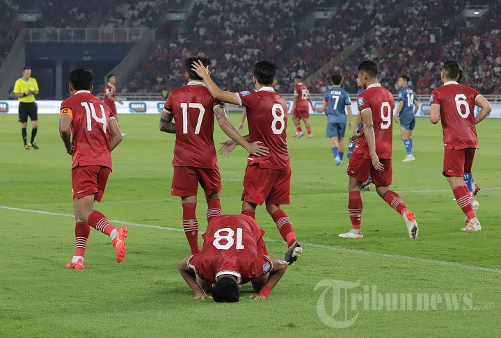 Selebrasi pemain timnas Indonesia Ramadhan Sananta usai berhasil mencetak gol ke gawang Brunei Darussalam pada laga kualifikasi piala dunia 2026 di Stadion Utama Gelora Bung Karno, Senayan, Jakarta Pusat, Kamis (12/10/2023). Pada laga tersebut Timnas Indonesia berhasil mengalahkan Brunei Darussalam dengan skor 6-0. Sebagai informasi Laga leg kedua lawan Brunei akan berlangsung pada 17 Oktober mendatang. Tribunnews/Jeprima