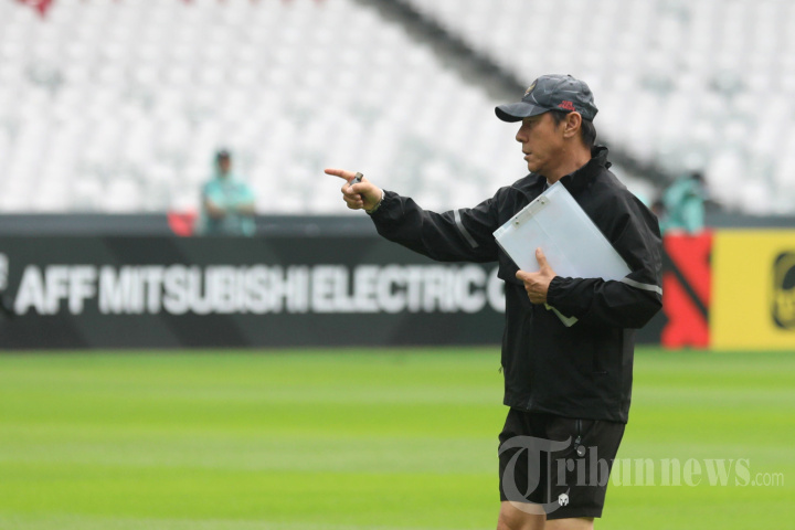 Pelatih Tim Nasional Indonesia Shin Tae-yong memberi instruksi saat latihan Timnas Indonesia di Stadion Utama Gelora Bung Karno, Jakarta, Kamis (22/12/2022). Latihan tersebut dilakukan jelang hadapi Kamboja pada Piala AFF 2022. TRIBUNNEWS/IRWAN RISMAWAN