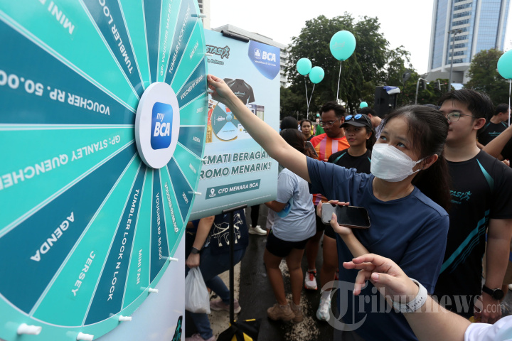 Peserta bermain games disela-sela acara Runvestasi 2024 di area Menara BCA, Jakarta, Minggu (8/12/2024). Dalam misi meningkatkan literasi keuangan masyarakat Indonesia, PT Bank Central Asia Tbk (BCA) menggelar kompetisi lari, jogging, dan jalan sehat virtual bertajuk Runvestasi yang berlangsung pada 8-22 Desember 2024. Kompetisi ini menggabungkan edukasi perencanaan finansial dengan gaya hidup sehat yang akrab di tengah masyarakat, yaitu olahraga. TRIBUNNEWS/IRWAN RISMAWAN