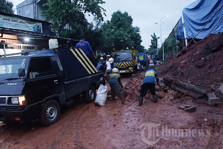 Petugas membersihkan bekas longsor turap dinding ruas tol JORR Bintaro, Jakarta Selatan, Sabtu (6/7/2024). Hujan dengan intensitas tinggi yang mengguyur Jakarta mengakibatkan dinding penahan tak sanggup menahan beban air hujan yang mengakibatkan longsor. Tribunnews/Jeprima