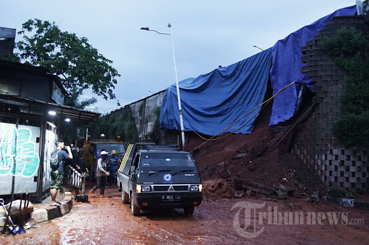 Petugas membersihkan bekas longsor turap dinding ruas tol JORR Bintaro, Jakarta Selatan, Sabtu (6/7/2024). Hujan dengan intensitas tinggi yang mengguyur Jakarta mengakibatkan dinding penahan tak sanggup menahan beban air hujan yang mengakibatkan longsor. Tribunnews/Jeprima
