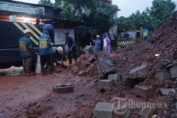 Petugas membersihkan bekas longsor turap dinding ruas tol JORR Bintaro, Jakarta Selatan, Sabtu (6/7/2024). Hujan dengan intensitas tinggi yang mengguyur Jakarta mengakibatkan dinding penahan tak sanggup menahan beban air hujan yang mengakibatkan longsor. Tribunnews/Jeprima