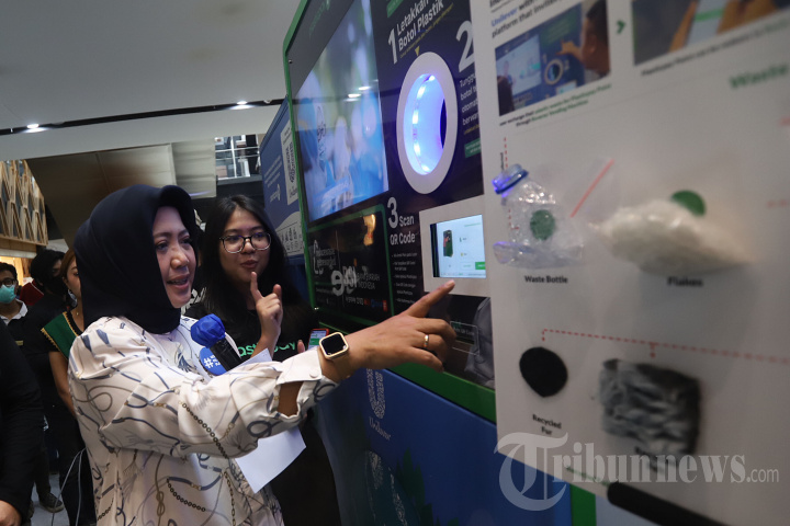Head of Division Environment & Sustainability Unilever Indonesia Foundation Maya Tamimi mencoba menukarkan botol plastik dengan mesin penukaran pada pameran interaktif bertema #GenerasiPilah Plastik: Dont Waste Your Time, Yuk Pilah Pilih untuk Indonesia yang Lebih Baik di Atrium Sarinah Thamrin, Jakarta Pusat, Sabtu (18/2/2023). Menyambut peringatan Hari Peduli Sampah Nasional (HPSN) 2023, Unilever Indonesia bersama Kementerian Lingkungan Hidup RI dan Dinas Lingkungan Hidup DKI Jakarta ini mengangkat urgensi penanggulangan sampah plastik melalui kolaborasi lintas sektor, serta menghadirkan beragam inovasi terkini untuk memudahkan konsumen mengadopsi gaya hidup yang lebih ramah lingkungan dan pintar dalam pilah pilih plastik. Tribunnews/Jeprima