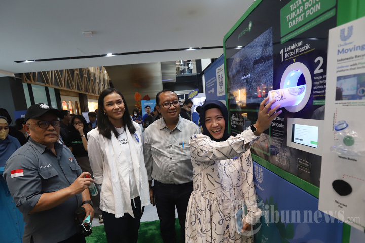 Head of Division Environment & Sustainability Unilever Indonesia Foundation Maya Tamimi (kanan) mencoba memasukkan botol plastik ke mesin Plasticpay disaksikan Kasubdit Barang dan Kemasan, Direktorat Pengurangan Sampah Ditjen PSLB3 Kementerian Lingkungan Hidup dan Kehutanan RI Ujang Solihin Sidik (kiri), Kepala Dinas Lingkungan Hidup DKI Jakarta Asep Kuswanto dan aktris pecinta lingkungan Adinia Wirasti (kedua kiri) usai menjadi pembicara pada diskusi dan pameran interaktif bertema #GenerasiPilah Plastik: Dont Waste Your Time, Yuk Pilah Pilih untuk Indonesia yang Lebih Baik di Atrium Sarinah Thamrin, Jakarta Pusat, Sabtu (18/2/2023). Menyambut peringatan Hari Peduli Sampah Nasional (HPSN) 2023, Unilever Indonesia bersama Kementerian Lingkungan Hidup RI dan Dinas Lingkungan Hidup DKI Jakarta ini mengangkat urgensi penanggulangan sampah plastik melalui kolaborasi lintas sektor, serta menghadirkan beragam inovasi terkini untuk memudahkan konsumen mengadopsi gaya hidup yang lebih ramah lingkungan dan pintar dalam pilah pilih plastik. Tribunnews/Jeprima
