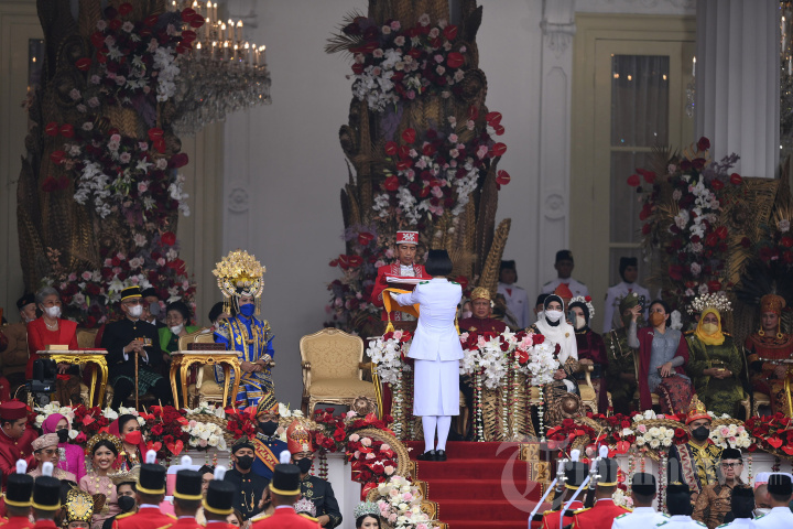 Presiden Joko WIdodo menyerahkan Sang Saka Merah Putih kepada Pasukan Pengibar Bendera Pusaka (Paskibraka) dalam Upacara Peringatan Detik-Detik Proklamasi Kemerdekaan ke-77 Republik Indonesia di Istana Merdeka, Jakarta, Rabu (17/8/2022). HUT ke-77 RI tersebut mengangkat tema Pulih Lebih Cepat, Bangkit Lebih Kuat. ANTARA FOTO/POOL/Sigid Kurniawan/rwa.