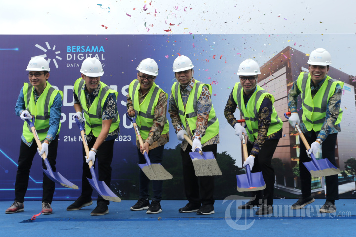 Menteri Komunikasi dan Informatika Republik Indonesia Budi Arie Setiadi (ketiga kanan) didampingi Presiden Komisaris Bersama Digital Data Centres Setyanto Hantoro (ketiga kiri), Presiden Direktur Bersama Digital Data Centres Angelo Syailendra (kedua kanan), Komisaris Bersama Digital Data Centres Andi Esfandi (kiri), Direktur Bersama Digital Infrastructure Asia Michael Soeryadjaya (kedua kiri) dan Ketua Umum Asosiasi Penyelenggara Jasa Internet Indonesia Muhammad Arif (kanan) melakukan topping off BDDC JST di Jakarta, Selasa (21/11/2023). BDDC JST hadir melalui akuisisi dari dua data center dalam kota yang diproyeksikan memiliki kapasitas mencapai 60 megawatt, yang akan memperkuat interkonektivitas di Jakarta. TRIBUNNEWS/IRWAN RISMAWAN