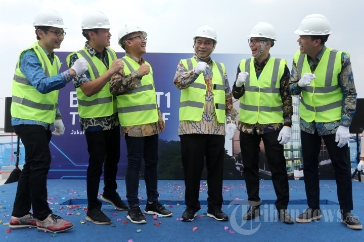 Menteri Komunikasi dan Informatika Republik Indonesia Budi Arie Setiadi (ketiga kanan) didampingi Presiden Komisaris Bersama Digital Data Centres Setyanto Hantoro (ketiga kiri), Presiden Direktur Bersama Digital Data Centres Angelo Syailendra (kedua kanan), Komisaris Bersama Digital Data Centres Andi Esfandi (kiri), Direktur Bersama Digital Infrastructure Asia Michael Soeryadjaya (kedua kiri) dan Ketua Umum Asosiasi Penyelenggara Jasa Internet Indonesia Muhammad Arif (kanan) berbincang usai melakukan topping off BDDC JST di Jakarta, Selasa (21/11/2023). BDDC JST hadir melalui akuisisi dari dua data center dalam kota yang diproyeksikan memiliki kapasitas mencapai 60 megawatt, yang akan memperkuat interkonektivitas di Jakarta. TRIBUNNEWS/IRWAN RISMAWAN
