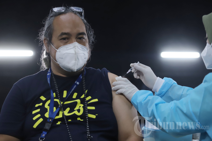 Karyawan Kompas Gramedia mengikuti vaksinasi booster di Menara Kompas, Jakarta, Selasa (25/1/2022). Vaksinasi booster atau dosis ketiga itu dilaksanakan selama tiga hari sampai dengan Kamis (27/1/2022) dan diikuti sekitar 2000 karyawan Kompas Gramedia. TRIBUNNEWS/HERUDIN