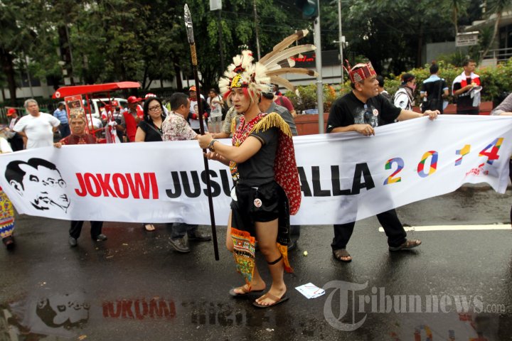 Perwakilan warga Dayak Kalimantan berpakaian tradisional menunjukkan keahliannya saat acara car free day di sekitar bundaran HI Jakarta Pusat untuk dukungan pasangan Jokowi-JK, Minggu (15/6/2014). Warga Dayak menilai pasangan Jokowi-JK dapat menjaga kebhinekaan yang ada di Indonesia. TRIBUNNEWS/HERUDIN