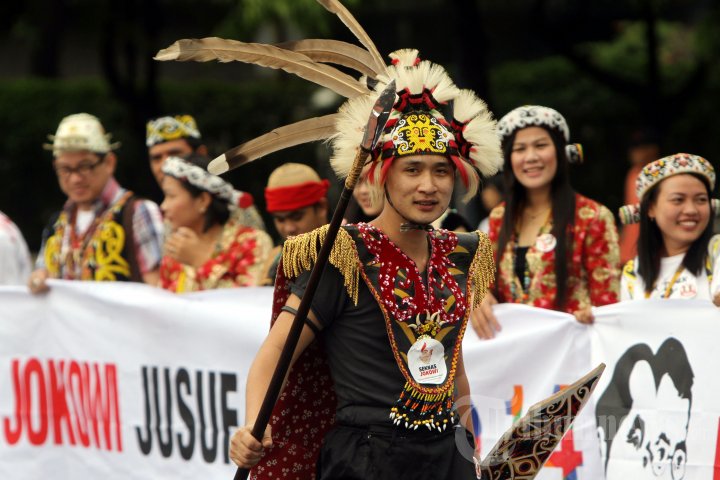 Perwakilan warga Dayak Kalimantan berpakaian tradisional menunjukkan keahliannya saat acara car free day di sekitar bundaran HI Jakarta Pusat untuk dukungan pasangan Jokowi-JK, Minggu (15/6/2014). Warga Dayak menilai pasangan Jokowi-JK dapat menjaga kebhinekaan yang ada di Indonesia. TRIBUNNEWS/HERUDIN