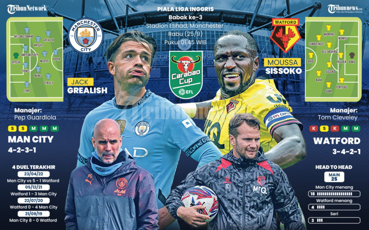 Laga Manchester City vs Watford menjadi satu di antara laga menarik di Piala ELF pekan ini yang berlangsung pada Rabu, 25 September 2024 pukul 01.45 WIB. Berikut prakiraan line-up kedua tim yang akan bertanding. TRIBUNNEWS/BAYU PRIADI