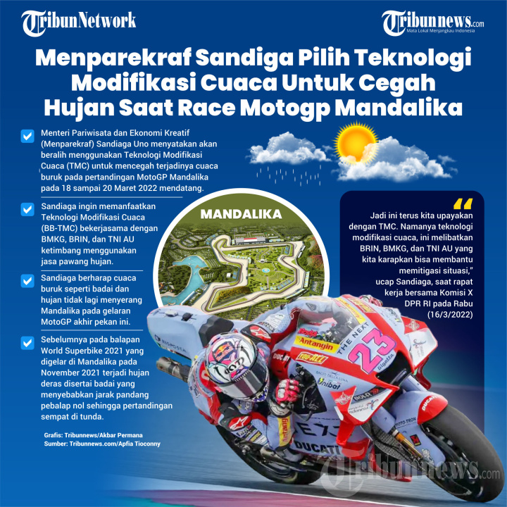Menteri Pariwisata dan Ekonomi Kreatif (Menparekraf) Sandiaga Uno menyatakan akan beralih menggunakan Teknologi Modifikasi Cuaca (TMC) untuk mencegah terjadinya cuaca buruk pada pertandingan MotoGP Mandalika pada 18 sampai 20 Maret 2022 mendatang. Sandiaga ingin memanfaatkan Teknologi Modifikasi Cuaca (BB-TMC) bekerjasama dengan BMKG, BRIN, dan TNI AU ketimbang menggunakan jasa pawang hujan. Sandiaga berharap cuaca buruk seperti badai dan hujan tidak lagi menyerang Mandalika pada gelaran MotoGP akhir pekan ini. TRIBUNNEWS/APFIA
