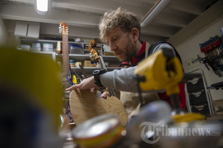Luthier Spanyol Fernando Solar bekerja di bengkelnya di Madrid pada 16 Desember 2021. - Dengan organisasi Ecoembes, Fernando Solar terlibat dalam proyek sosial "The Music of Recycling", yang menawarkan instrumen daur ulang dan pelatihan musik kepada anak-anak yang berisiko sosial pengecualian. (Photo by PIERRE-PHILIPPE MARCOU / AFP)