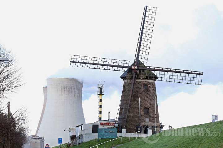 Foto ini diambil pada 7 Januari 2022 menunjukkan kincir angin di dekat menara pendingin pembangkit nuklir Doel di Engie di Doel dekat Antwerpen. - Desa Doel menghadapi pertempuran terakhirnya untuk bertahan hidup melawan rencana untuk memperluas pelabuhan Antwerpen yang berdekatan yang akan menghapusnya dari peta untuk membuka jalan bagi dermaga baru di Doel dekat kota pelabuhan Antwerpen. (Photo by Franv