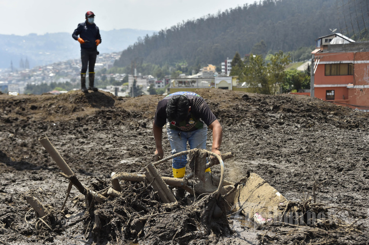 Seorang pria melihat ke puing-puing di lokasi di mana sebuah lapangan olahraga disapu bersih, di Quito pada 2 Februari 2022. - Banjir terparah yang melanda Ekuador dalam dua dekade telah menewaskan sedikitnya 24 orang di Quito, menggenangi rumah, membanjiri mobil dan menyapu tandang atlet dan penonton di lapangan olahraga, kata para pejabat Selasa. (Photo by Rodrigo BUENDIA / AFP)