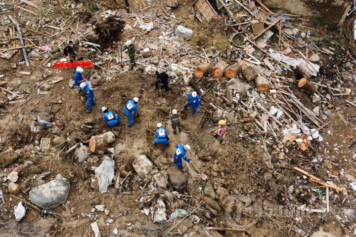 Pemandangan udara tim penyelamat memindahkan puing-puing selama pencarian korban setelah tanah longsor yang disebabkan oleh hujan lebat di Pereira, departemen Risaralda, Kolombia, pada 8 Februari 2022. - Tanah longsor tersebut menewaskan 7 orang dan melukai 29 orang di lingkungan Pereira pada hari Selasa, karena hujan lebat dalam beberapa hari terakhir, menurut pihak berwenang. (Photo by Luis ROBAYO / AFP)