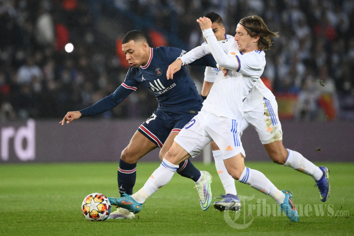 Striker Paris Saint-Germain asal Perancis, Kylian Mbappe (kiri) berebut bola dengan gelandang Real Madrid asal Kroasia, Luka Modric dalam laga leg pertama babak 16 besar Liga Champions antara Paris Saint-Germain (PSG) melawan Real Madrid di Stadion Parc des Princes, Paris, Perancis, Rabu (16/2/2022) dini hari WIB. PSG berhasil memetik kemenangan dengan skor 1-0 (0-0). AFP/FRANCK FIFE