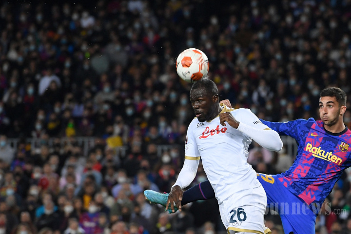 Striker Barcelona asal Spanyol, Ferran Torres (kanan) berebut bola atas dengan bek Napoli asal Senegal, Kalidou Koulibaly dalam laga Liga Europa antara FC Barcelona melawan SSC Napoli di Stadion Camp Nou, Barcelona, Spanyol, Jumat (18/2/2022) dini hari WIB. Pertandingan berakhir imbang dengan skor 1-1 (0-1). AFP/JOSEP LAGO