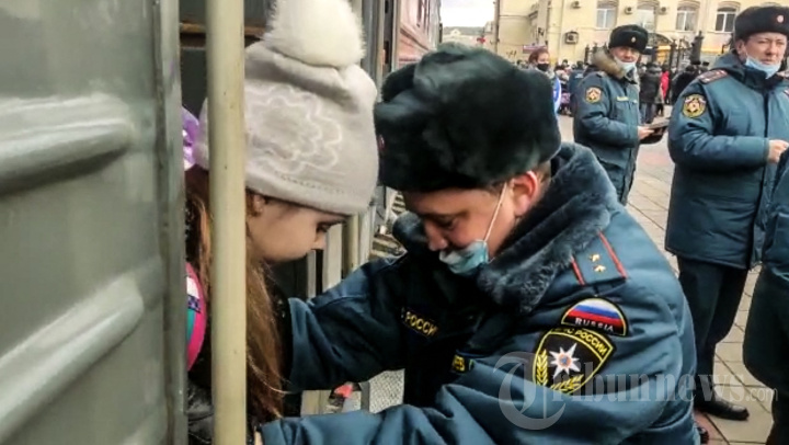 Video handout yang diambil dan dirilis pada 20 Februari 2022 oleh Kementerian Situasi Darurat Rusia ini menunjukkan seorang petugas Kementerian Darurat membantu seorang gadis ketika orang-orang yang dievakuasi dari Republik Rakyat Donetsk yang memproklamirkan diri tiba di stasiun kereta api di kota Voronezh. - Wilayah Rusia yang menaiki Ukraina mengumumkan keadaan darurat pada 19 Februari 2022, dengan alasan semakin banyak orang yang datang dari wilayah yang dikuasai separatis di Ukraina setelah mereka menerima perintah evakuasi. (Photo by Handout / RUSSIAN EMERGENCY SITUATIONS MINISTRY / AFP)
