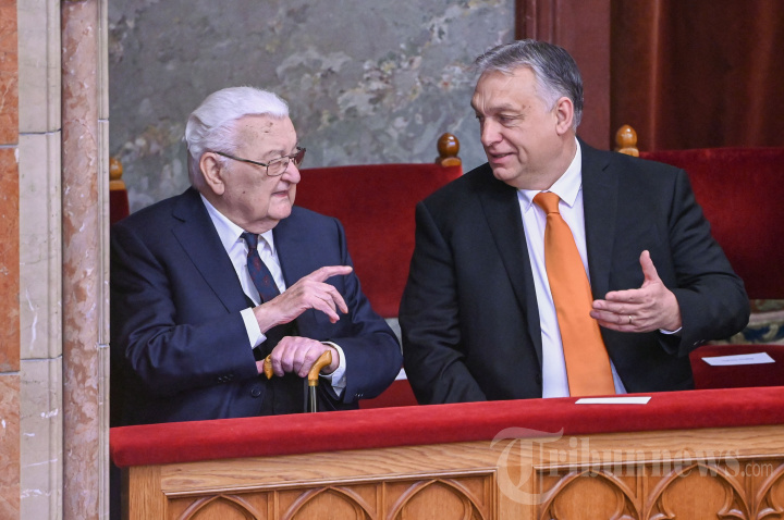 Perdana Menteri Hongaria Viktor Orban (kanan) berbicara dengan mantan Perdana Menteri Hongaria Peter Boros (kiri) di aula utama gedung parlemen pada 10 Maret 2022 sebelum pemilihan rahasia Presiden baru Hongaria. - Katalin Novak, sekutu dekat Perdana Menteri Viktor Orban, diperkirakan akan terpilih sebagai presiden wanita pertama anggota Uni Eropa. Novak, yang baru-baru ini menjabat sebagai menteri kebijakan keluarga, menggambarkan pemilihannya sebagai kemenangan bagi perempuan.