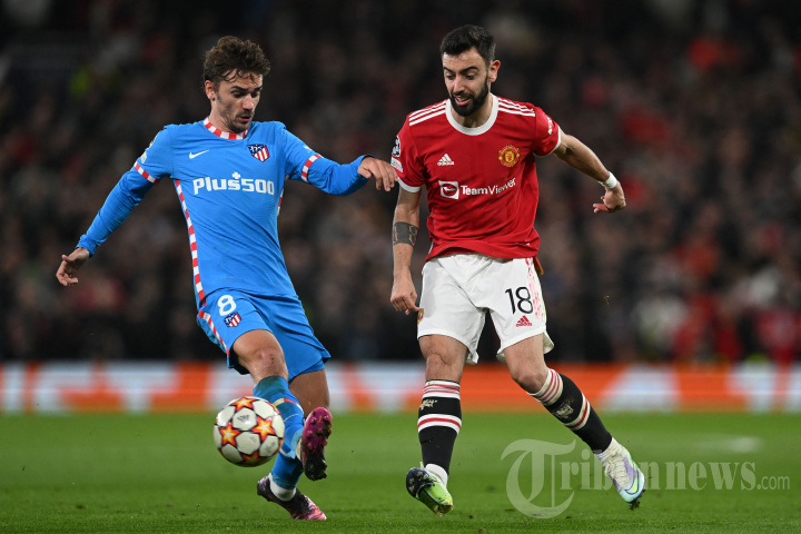 Striker Atletico Madrid Prancis Antoine Griezmann (kiri) bersaing dengan gelandang Manchester United asal Portugal Bruno Fernandes (kanan) selama pertandingan sepak bola leg kedua babak 16 besar Liga Champions UEFA antara Manchester United dan Atletico Madrid di stadion Old Trafford di Manchester, barat laut Inggris pada Maret 15, 2022. (Photo by Paul ELLIS / AFP)