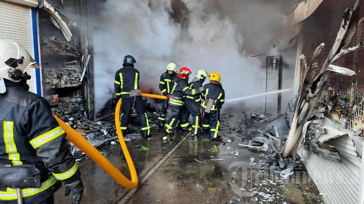 Dalam gambar selebaran yang diambil dan dirilis oleh Layanan Darurat Negara Ukraina pada 16 Maret 2022, petugas pemadam kebakaran bekerja untuk memadamkan api di pasar yang dilanda penembakan di Kharkiv. (Photo by Handout / State Emergency Service of Ukraine / AFP)