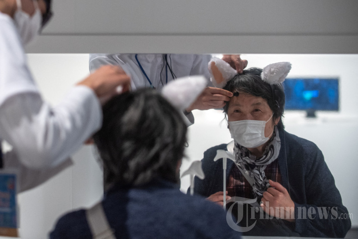 Seorang pengunjung memakai perangkat "Necomimi" (telinga kucing) oleh NeuroSky, alat komunikasi nonverbal yang dilengkapi dengan sensor yang membaca gelombang otak pemakainya dan menyesuaikan posisi telinga perangkat tersebut, selama "You and Robots ? What is to be Human?" pameran di National Museum of Emerging Science and Innovation di Tokyo pada 22 Maret 2022. (Photo by Philip FONG / AFP)