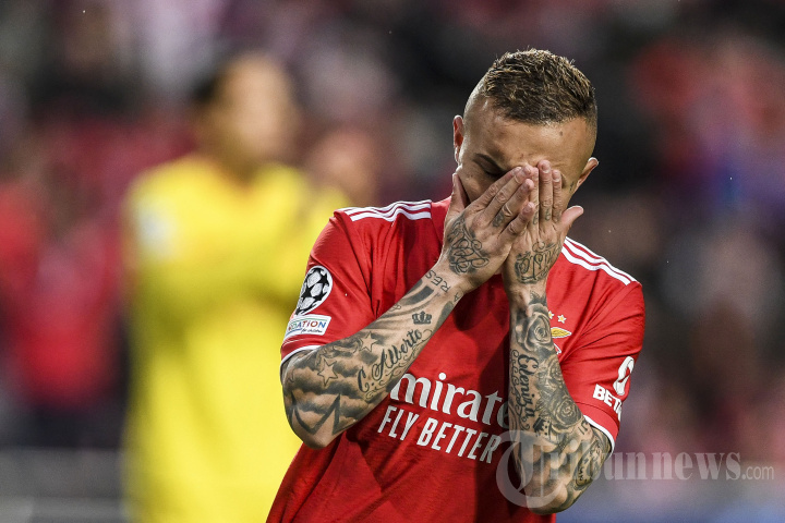 Penyerang Benfica asal Brasil, Everton, bereaksi selama pertandingan sepak bola leg pertama perempat final Liga Champions UEFA antara SL Benfica dan Liverpool FC di stadion Luz di Lisbon pada 5 April 2022. (Photo by PATRICIA DE MELO MOREIRA / AFP)